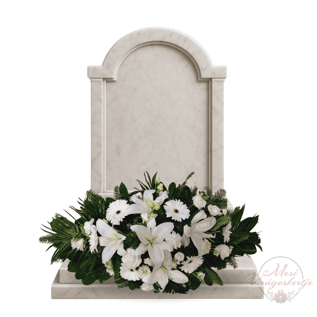 A sírpárna formája különösen alkalmas sírkő előtti elhelyezésre, és jól illeszkedik a márvány háttérhez. Ez a kompozíció ideális választás azok számára, akik letisztult, természetközeli és érzelmileg gazdag virágdíszt keresnek szeretteik sírjára.