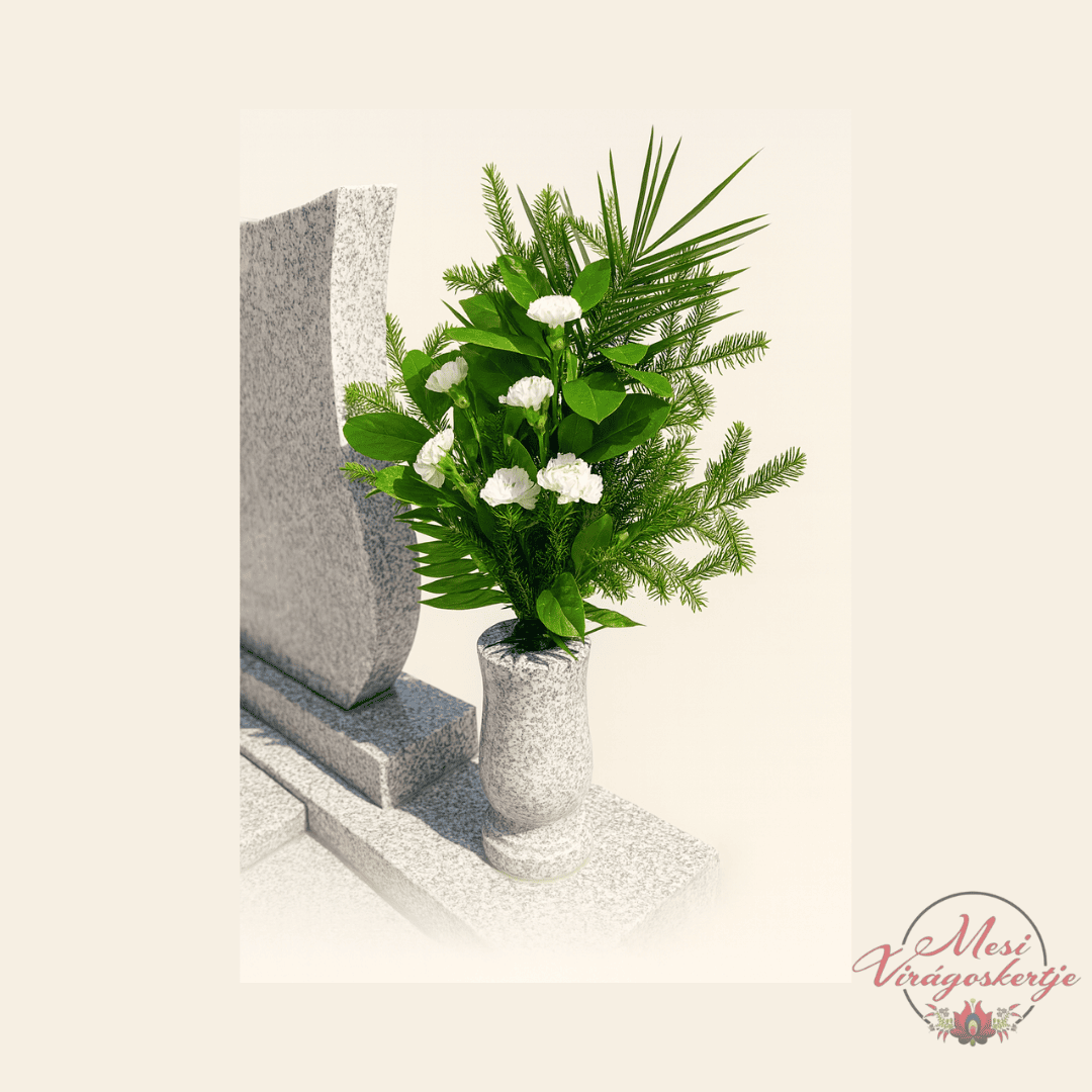 Ez a temetői vázacsokor fehér szegfűből készült, pálmalevéllel és zöld kiegészítőkkel díszítve. A fehér szegfű a tisztelet és az emlékezés virága, amely méltó módon fejezi ki a szeretetet és a békét. A pálmalevél klasszikus eleganciát ad a kompozíciónak, amely világos szürke gránit vázában kapott helyet.
