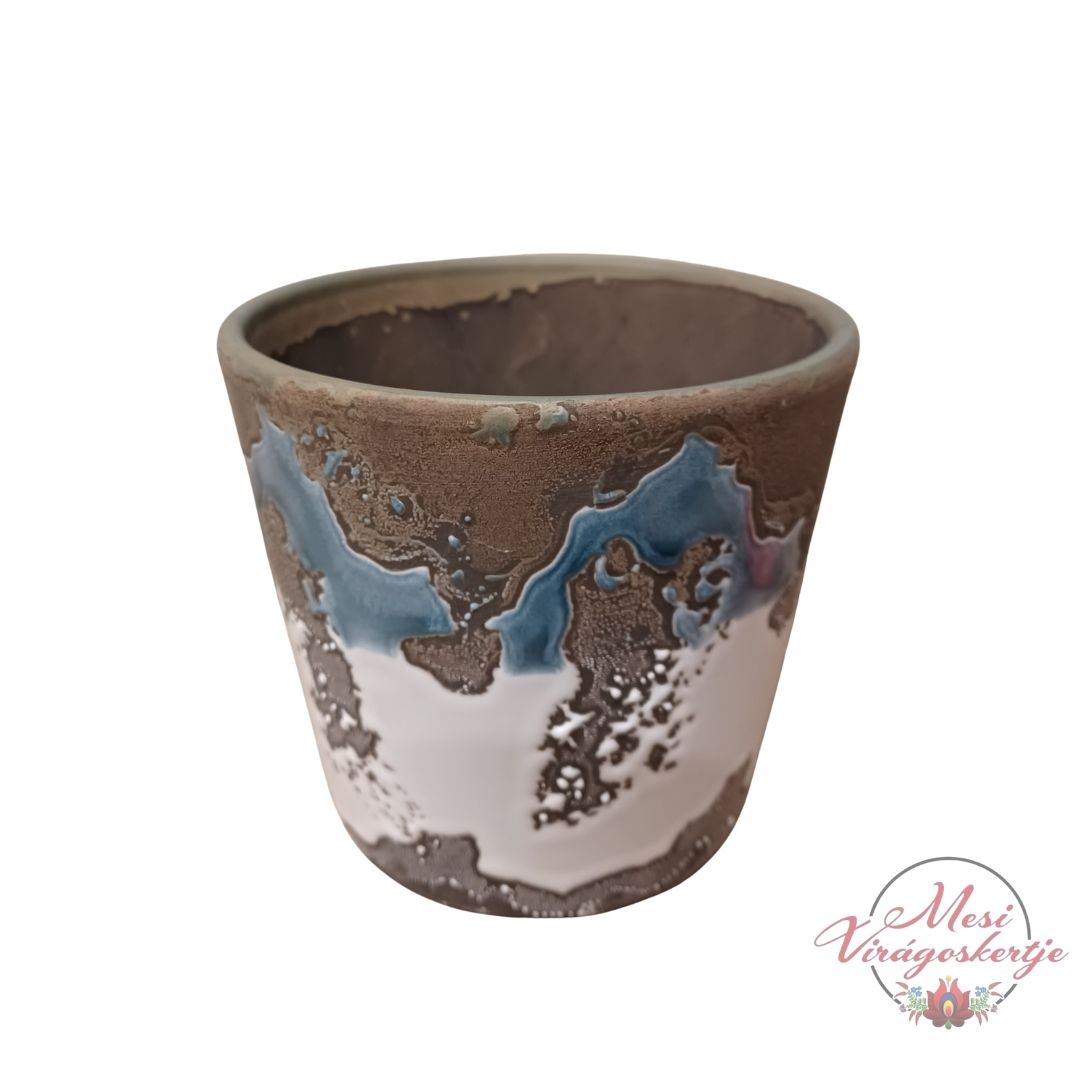 Egyedi megjelenésű texturált mázas kerámia kaspó, különleges felülettel és természetes hatású színátmenetekkel. Dekoratív választás növényekhez.