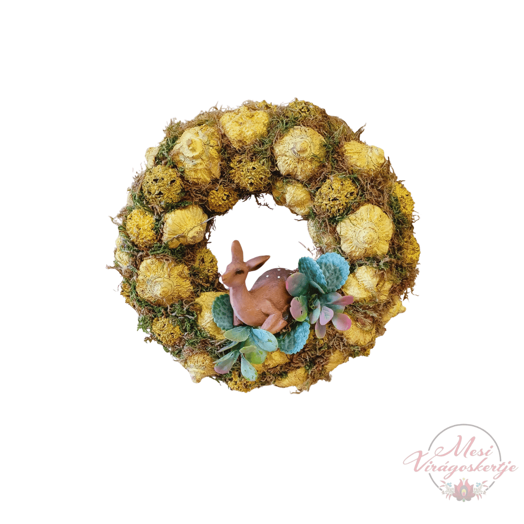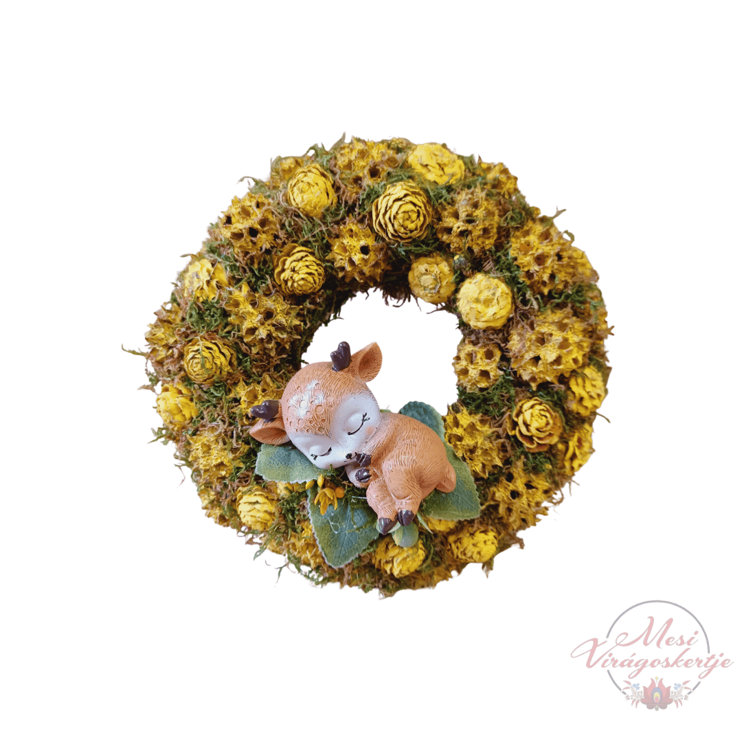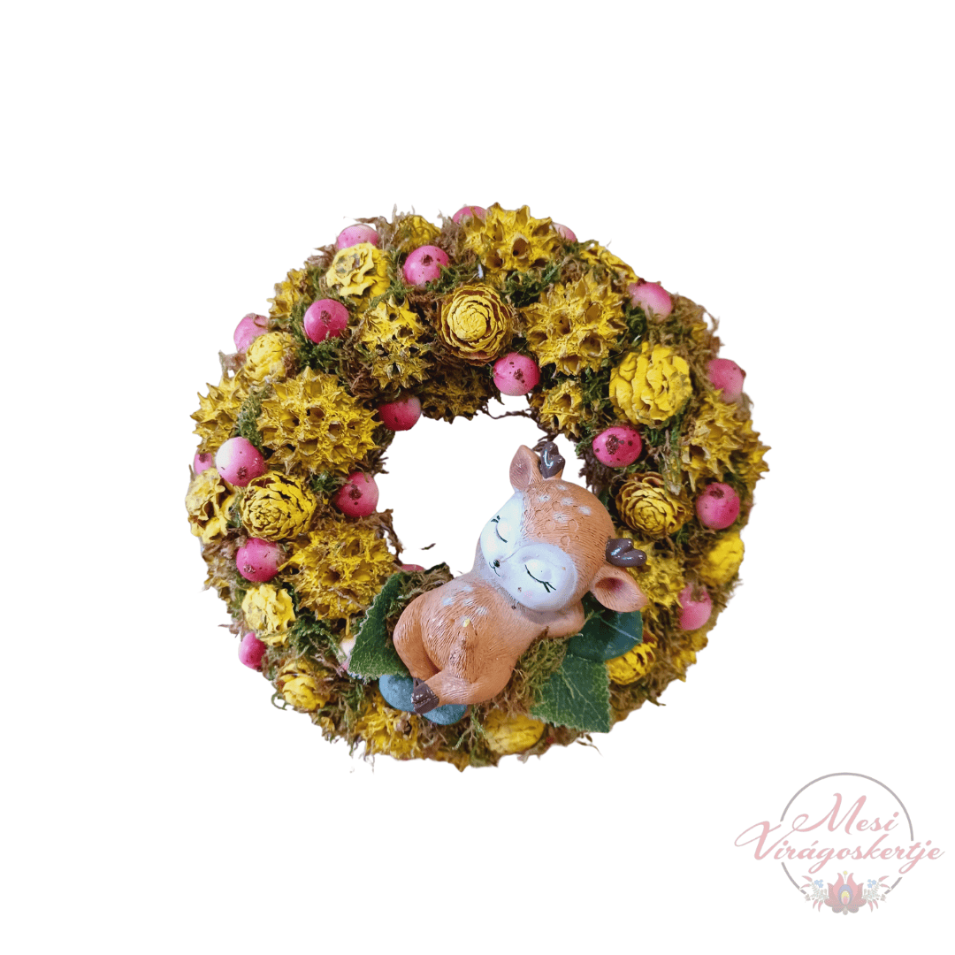 A Többféle őzikés kopogtató (16 cm) kézzel készült, természetes alapanyagokból és szárazvirágokból összeállított dekoráció. A középen elhelyezett aranyos őzikefigura kedves, mesés hangulatot áraszt, a sárga és rózsaszín díszek pedig vidám színvilágot teremtenek. Tökéletes ajtó- vagy faldekoráció tavaszra, gyerekszobába, vagy akár ajándékként is. Tartós, gondozásmentes kézműves dísz.