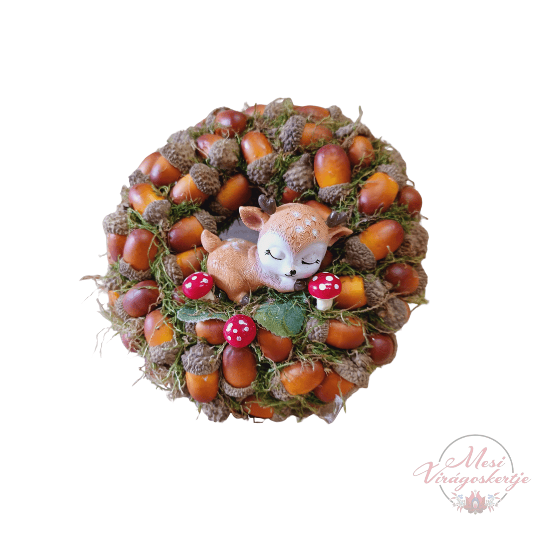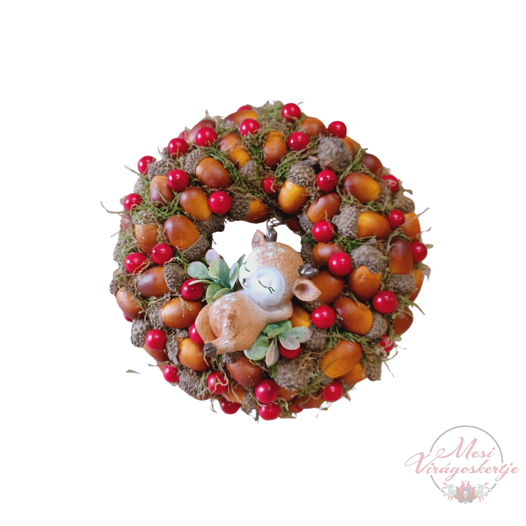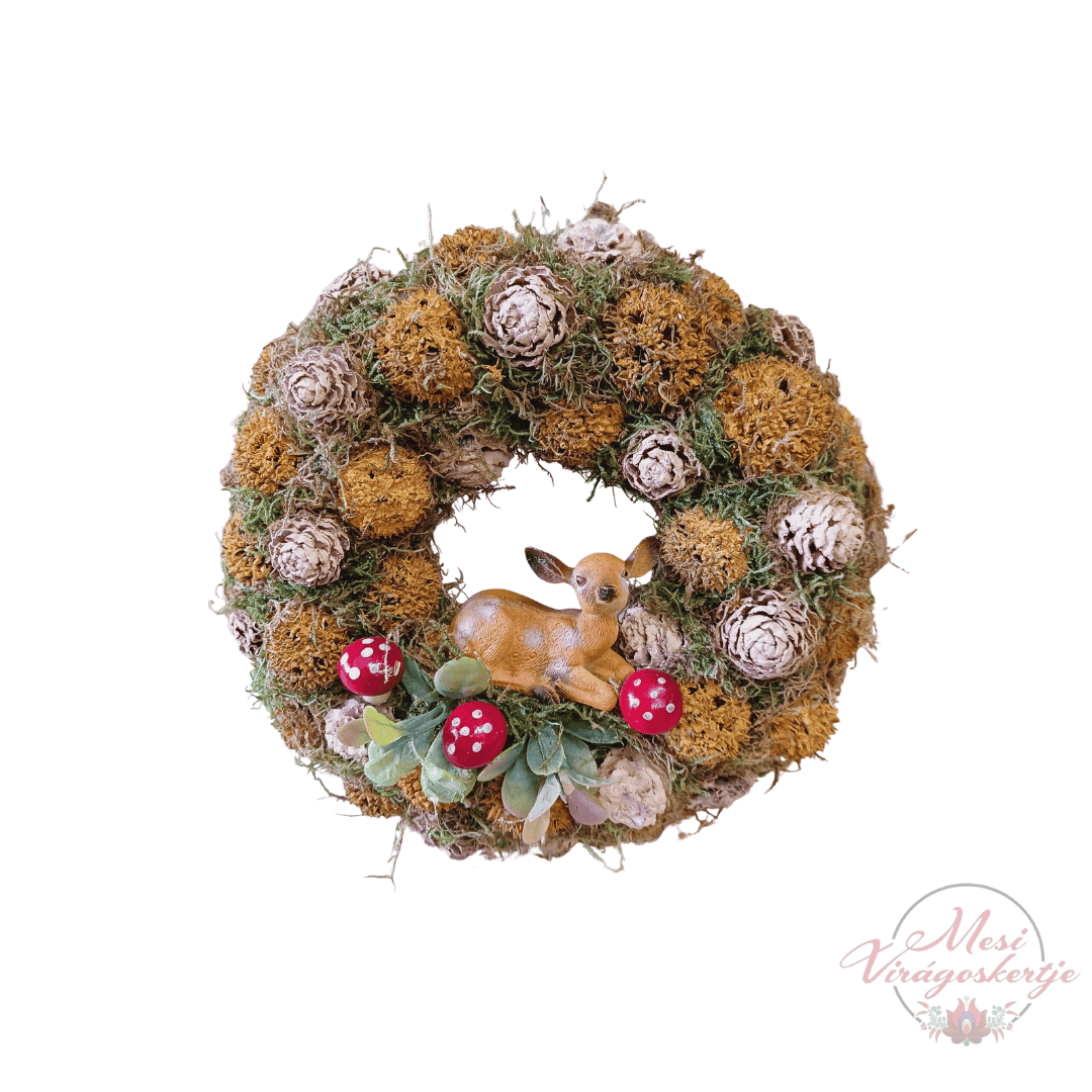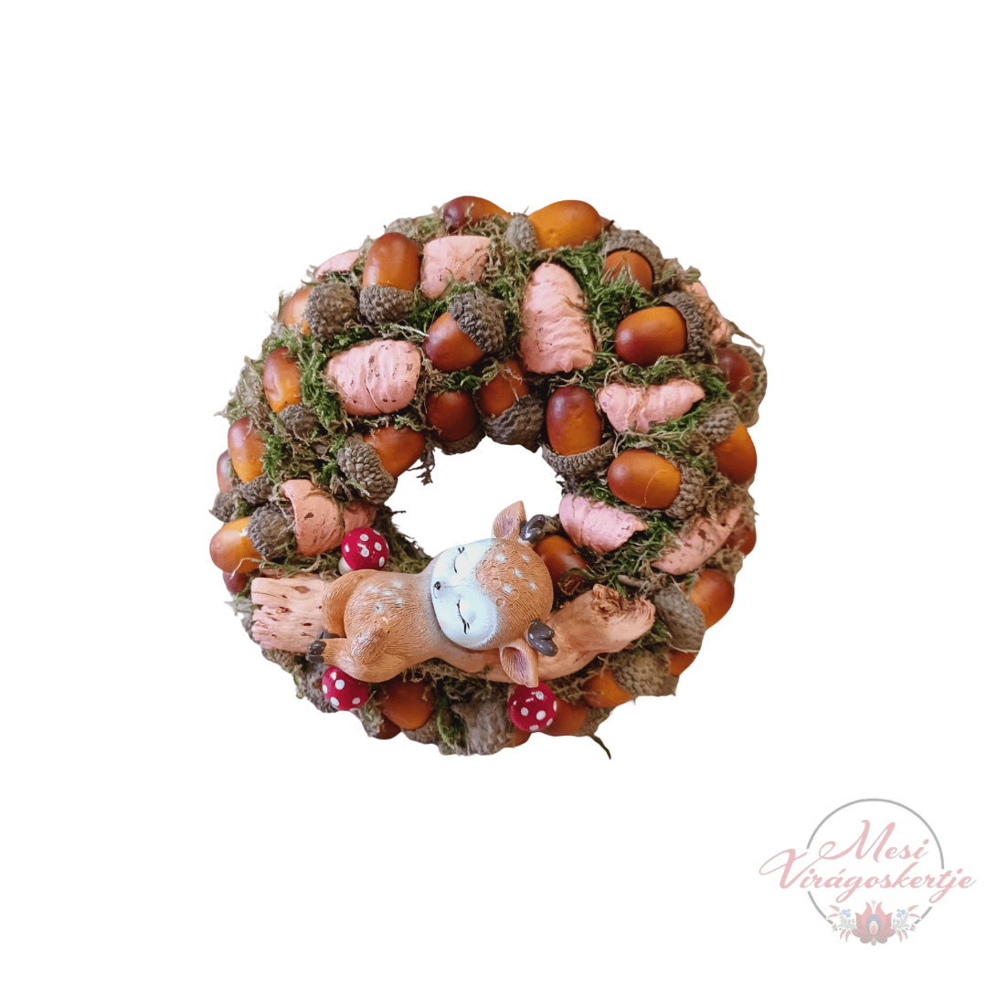 A Többféle őzikés kopogtató (16 cm) kézzel készült, természetes alapanyagokból és szárazvirágokból összeállított dekoráció. A középen elhelyezett aranyos őzikefigura kedves, mesés hangulatot áraszt, a sárga és rózsaszín díszek pedig vidám színvilágot teremtenek. Tökéletes ajtó- vagy faldekoráció tavaszra, gyerekszobába, vagy akár ajándékként is. Tartós, gondozásmentes kézműves dísz.