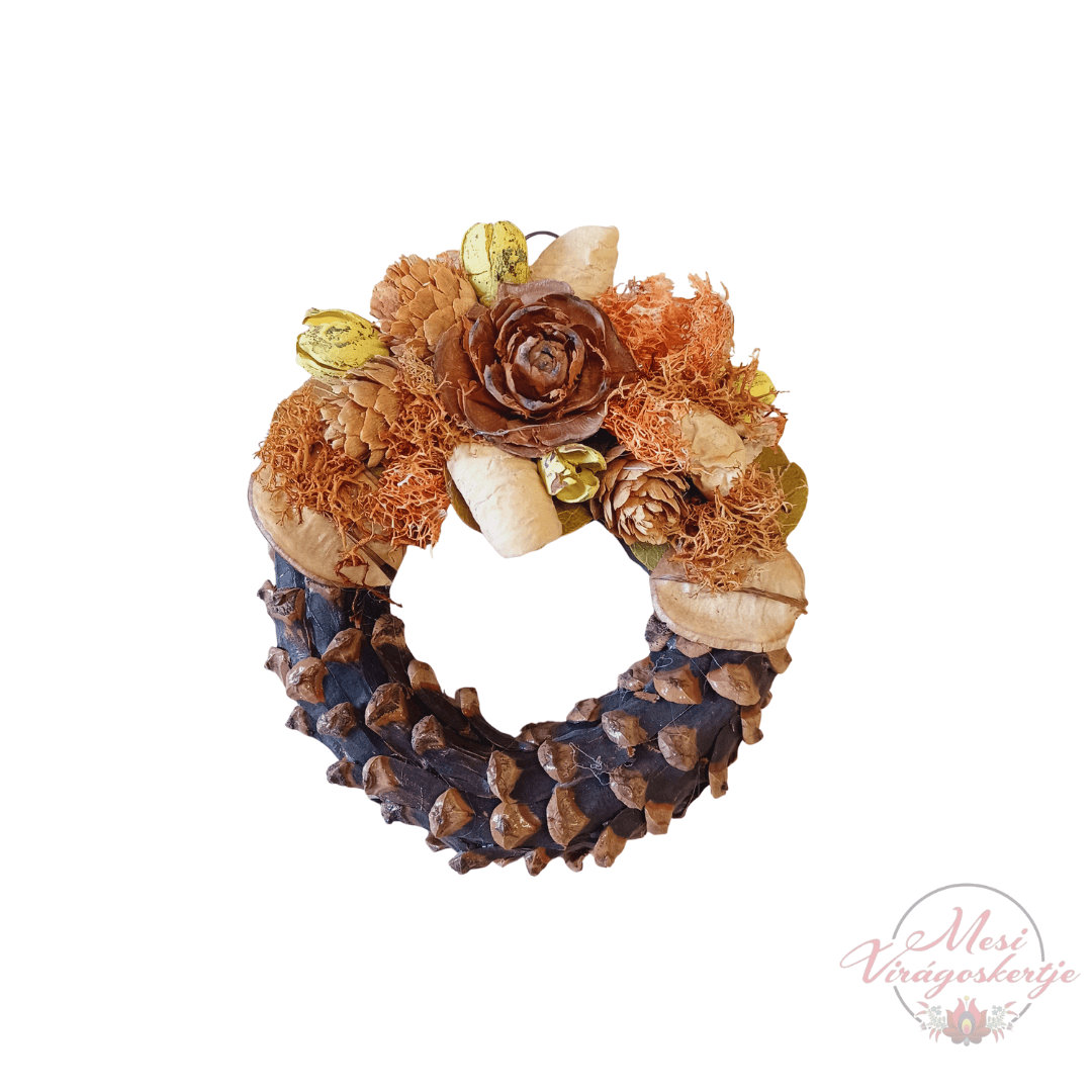Egyedi, 13 cm-es toboz alapú kopogtató szárazvirágokkal – természetes, rusztikus hangulatú kézműves ajtó- vagy faldekoráció.