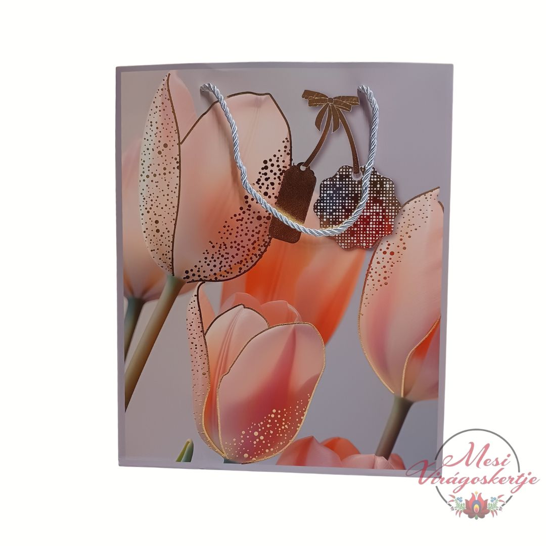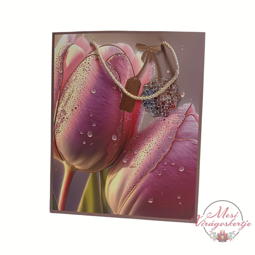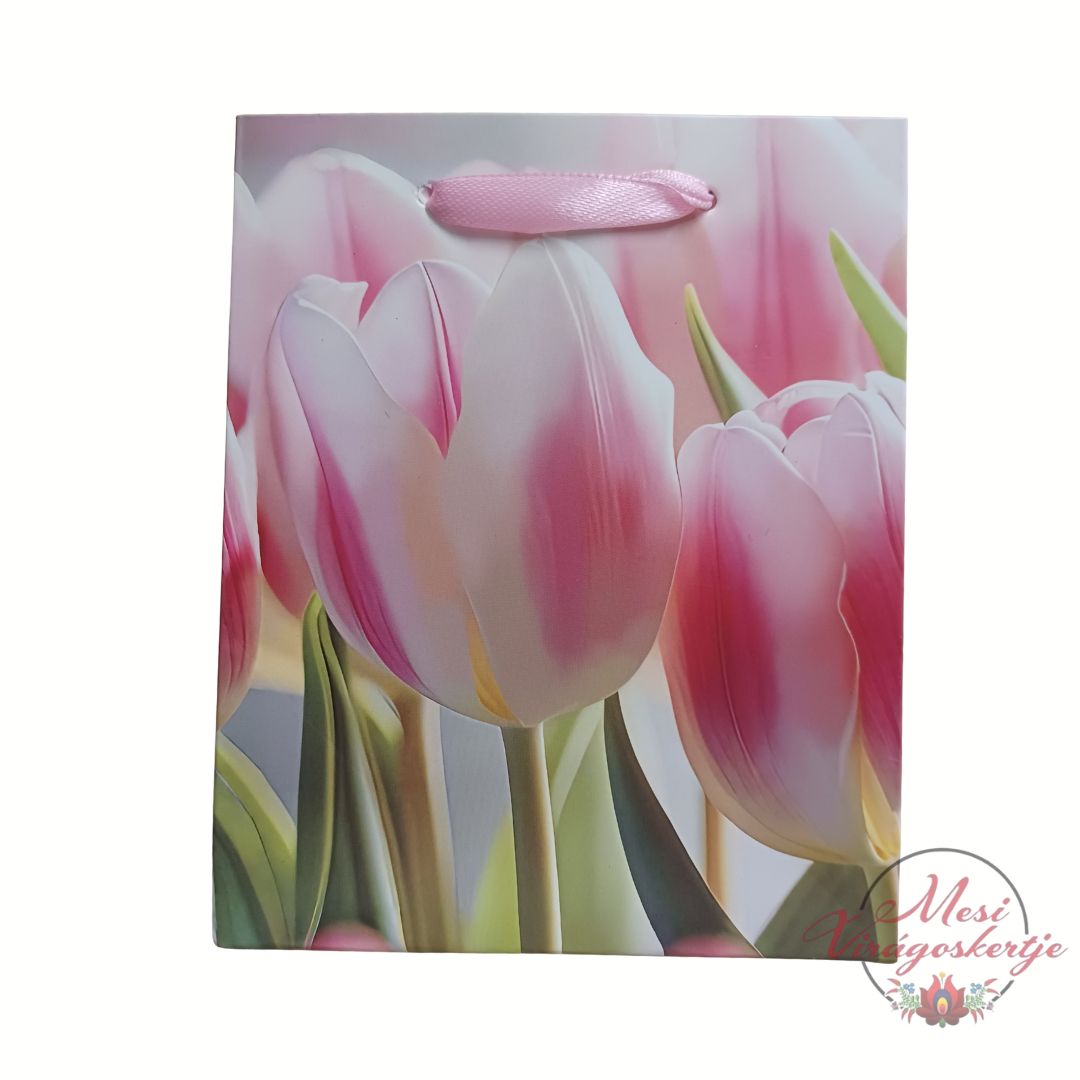 Elegáns tulipán mintás ajándéktáska romantikus színvilággal. Ideális virágokhoz, ajándékokhoz és különleges alkalmakra.