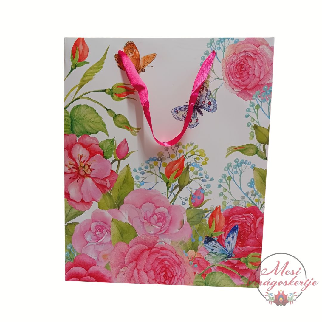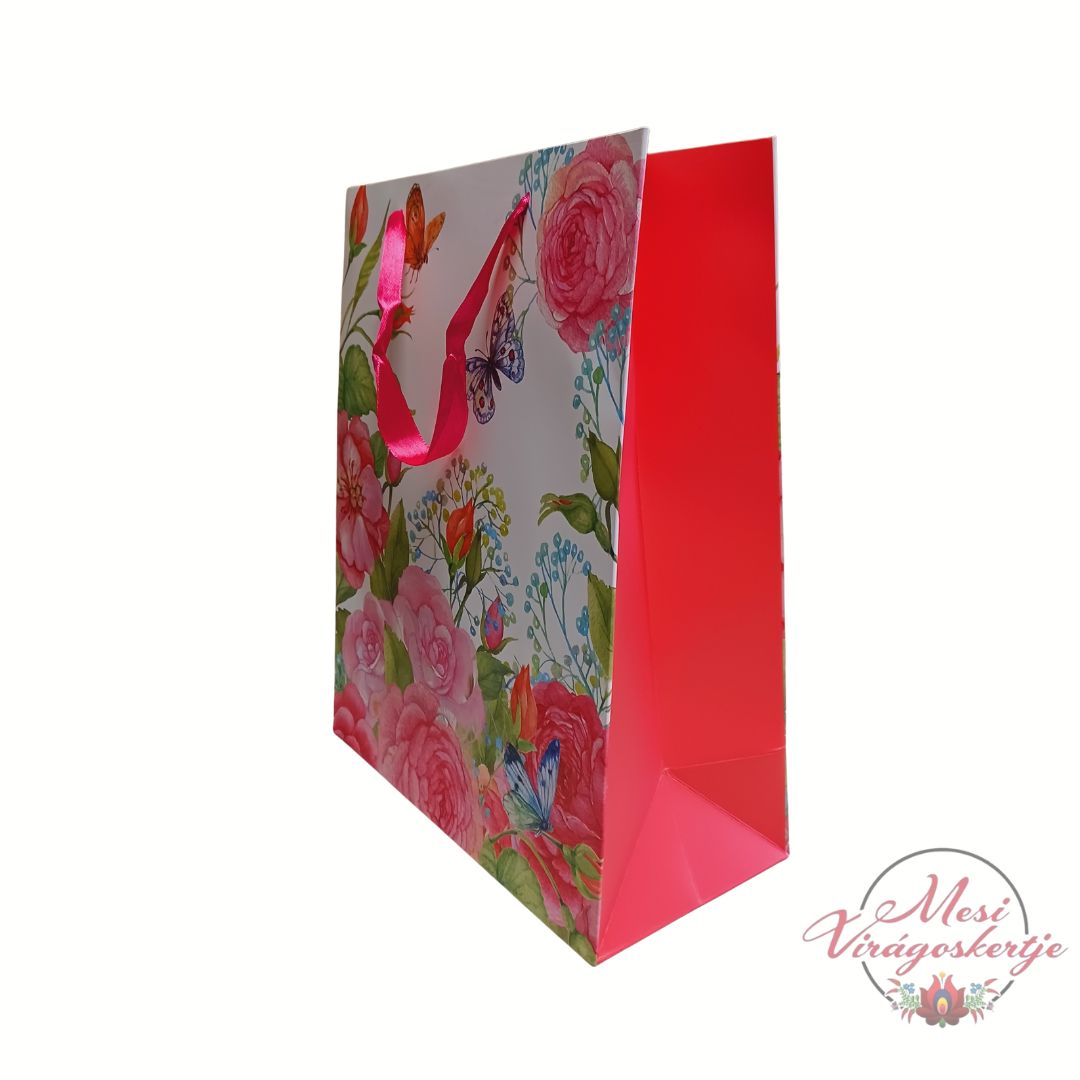 Elegáns, romantikus hangulatú ajándéktáska gazdag virágmintával és pillangó motívumokkal, erős papírból, szalagfüllel.